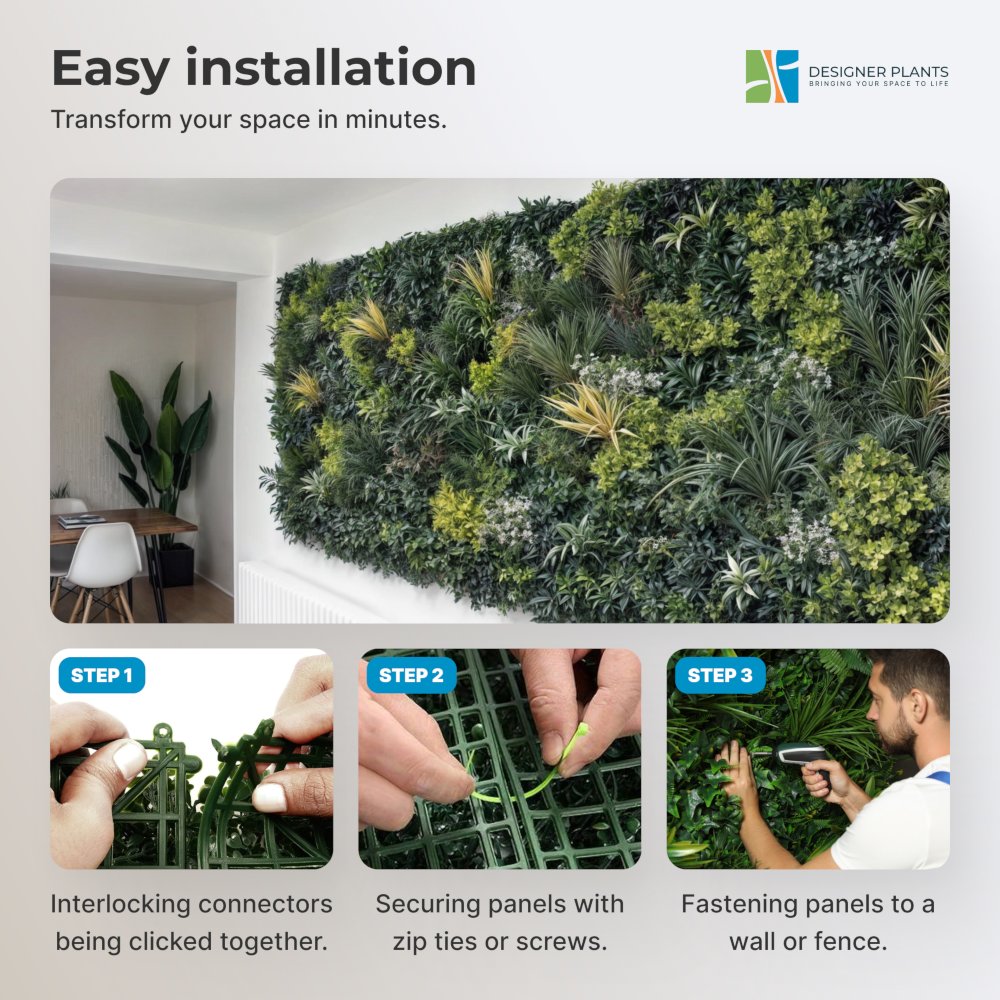 Our green wall panel range are perfect for attaching to walls, and can be attached using a range of equipment: staples, screws, or hooks depending on the surface. You can view our install guide here.