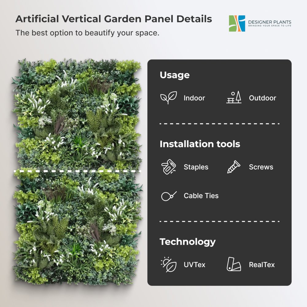 The panel has a metal backing that makes it easy to install and cut or shape to suit your space. It comes with a unique ‘snap and lock system’ so that it easily connects to other panels, as your collection of realistic artificial vertical wall panels grows! And grow it will, as grouped these panels create a striking masterpiece – a green wonderland of evergreen, tangled, wild, and flourishing nature.