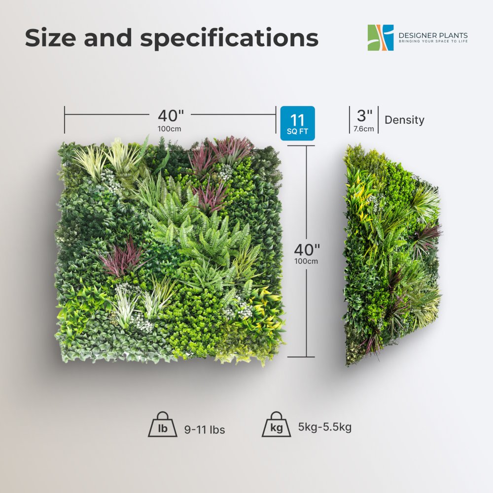 Fabricados con follaje de alta calidad resistente a los rayos UV, puede estar seguro de que tendrá paneles de pared verdes de la mejor calidad, sin importar si desea instalarlos en una pared interior o exterior. Cada panel está hecho a mano y viene en un panel cuadrado de 40" x 40" pulgadas que se puede conectar al siguiente panel o cortar con un par de tijeras al tamaño adecuado, lo que permite que nuestros paneles de jardín verticales se personalicen fácilmente al tamaño que desee. deseo.