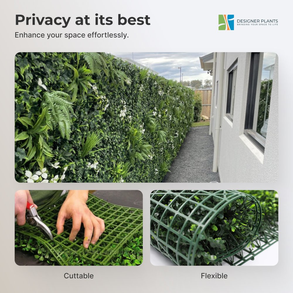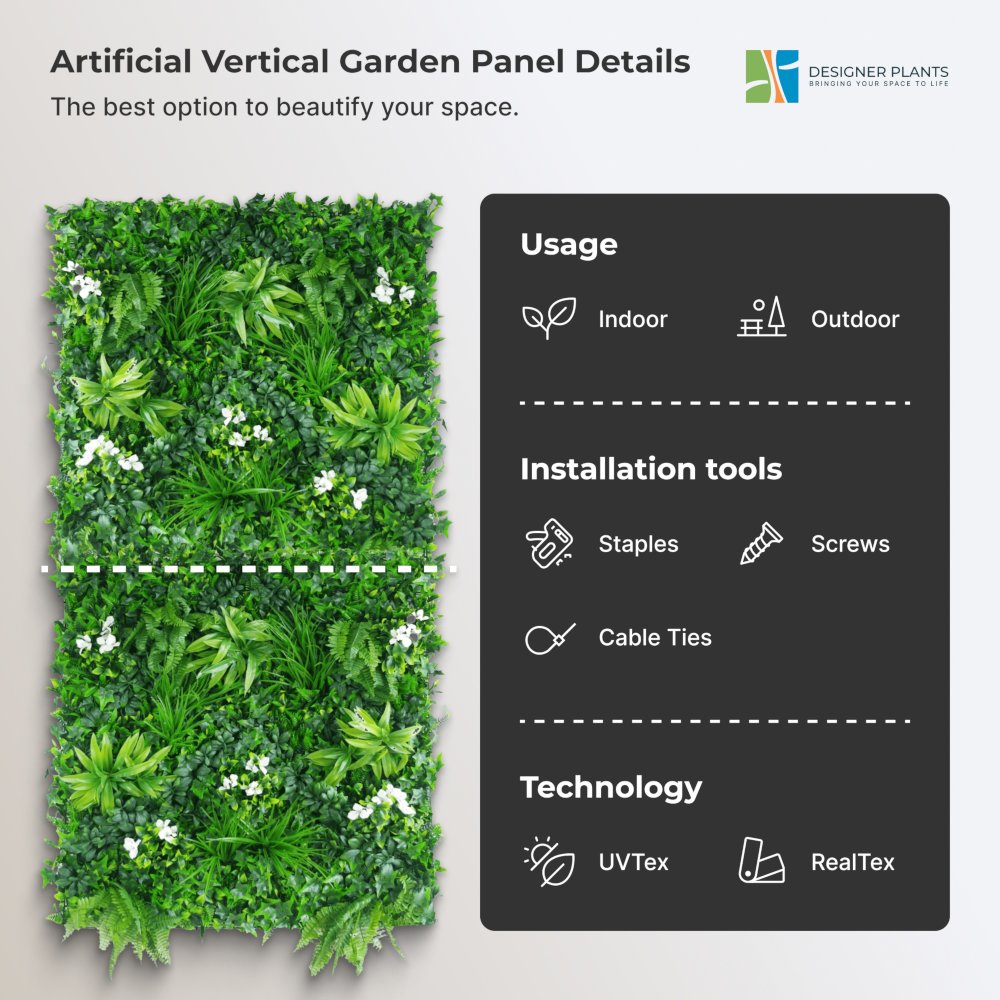 Transforme cualquier pared aburrida en una impresionante pared verde con la pared verde con flores artificiales de Designer Plants. Nuestros paneles de primera línea presentan flores vibrantes y realistas (empaquetadas por separado y fáciles de insertar donde desee) que seguramente realzarán cualquier espacio con su belleza y elegancia. Cada panel está elaborado con materiales de la más alta calidad para garantizar durabilidad y longevidad y viene como un panel de 40" x 40" pulgadas que se puede unir con el siguiente o cortar a la medida.