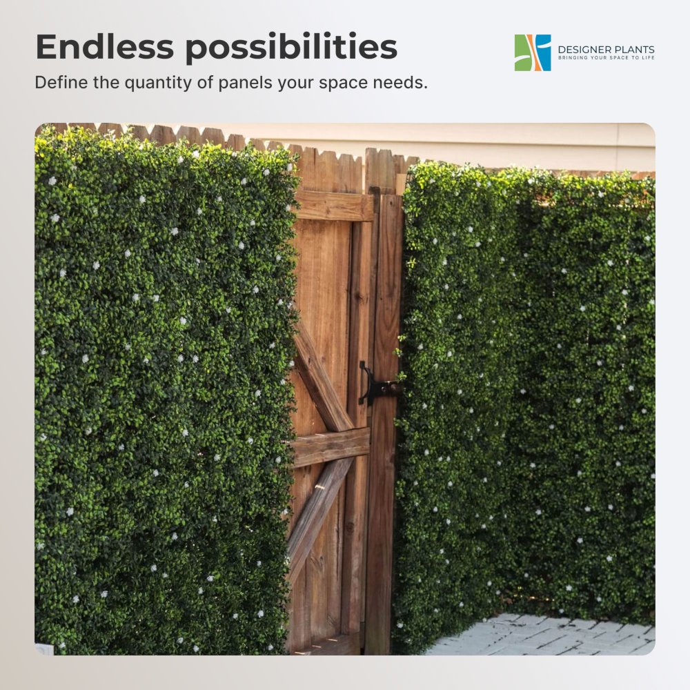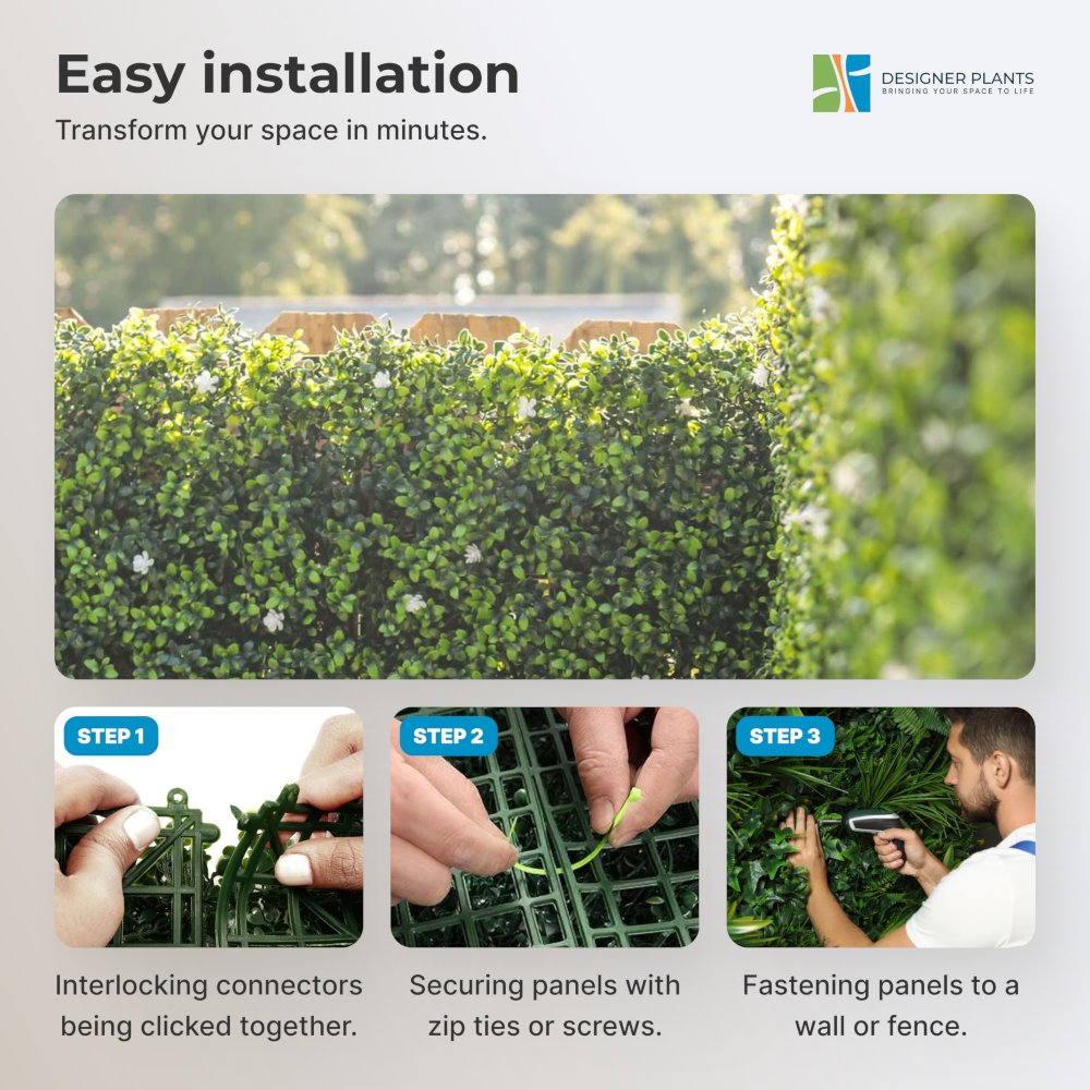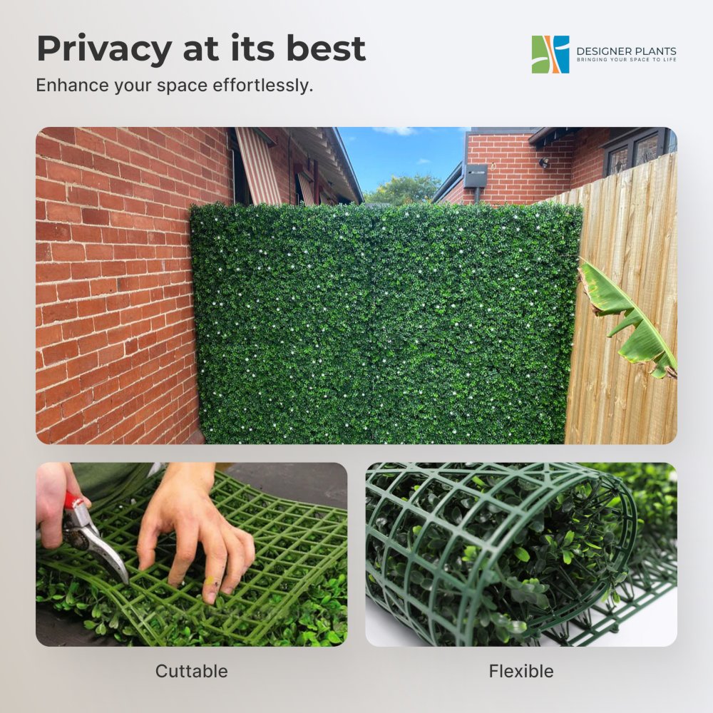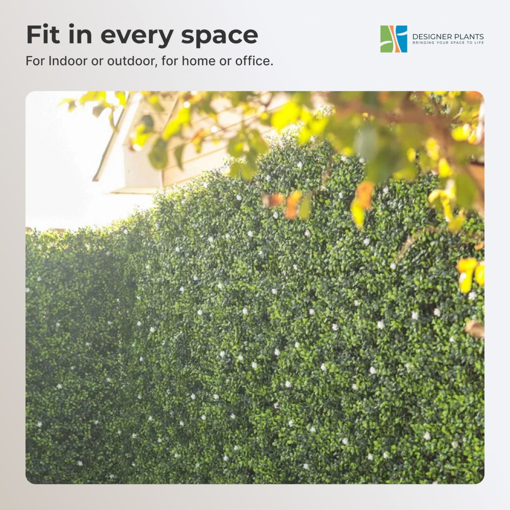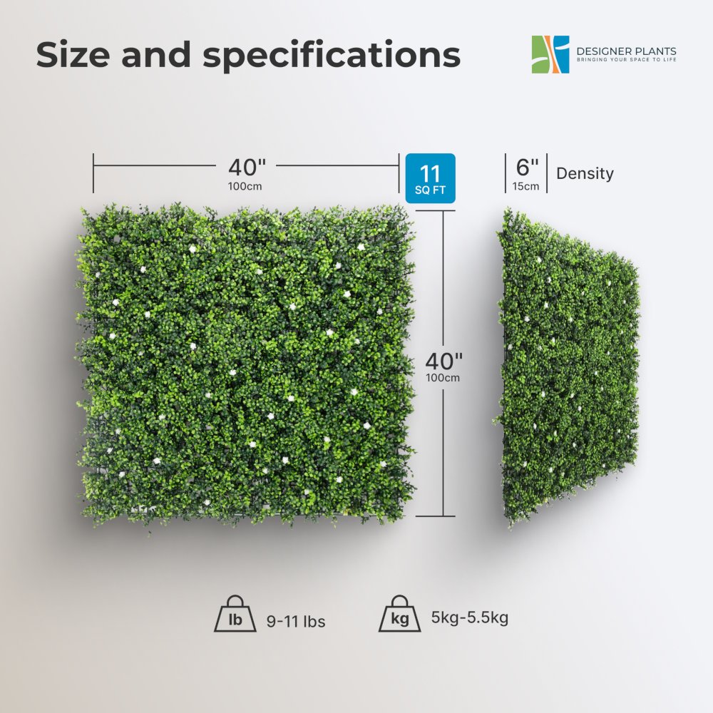 Nuestros impresionantes paneles para setos de boj en flor están disponibles en paneles cuadrados de 40 pulgadas que se conectan fácilmente entre sí. Puede recortarlos a cualquier tamaño o forma que desee para cubrir cualquier superficie, creando un ajuste personalizado para su espacio único. Con su tamaño y forma versátiles, nuestra vegetación artificial se puede usar para cubrir áreas grandes, como cercas de patios traseros o paredes viejas, o como pequeños detalles en balcones y patios.