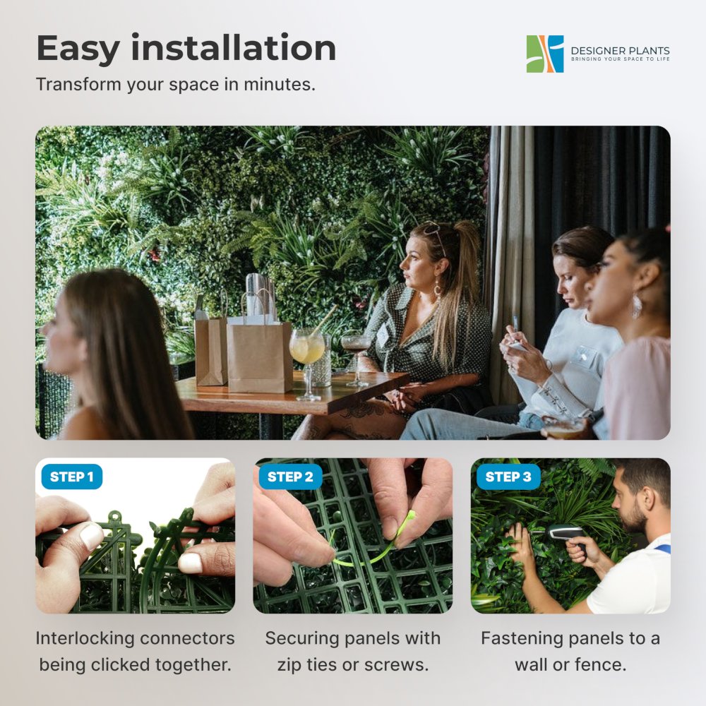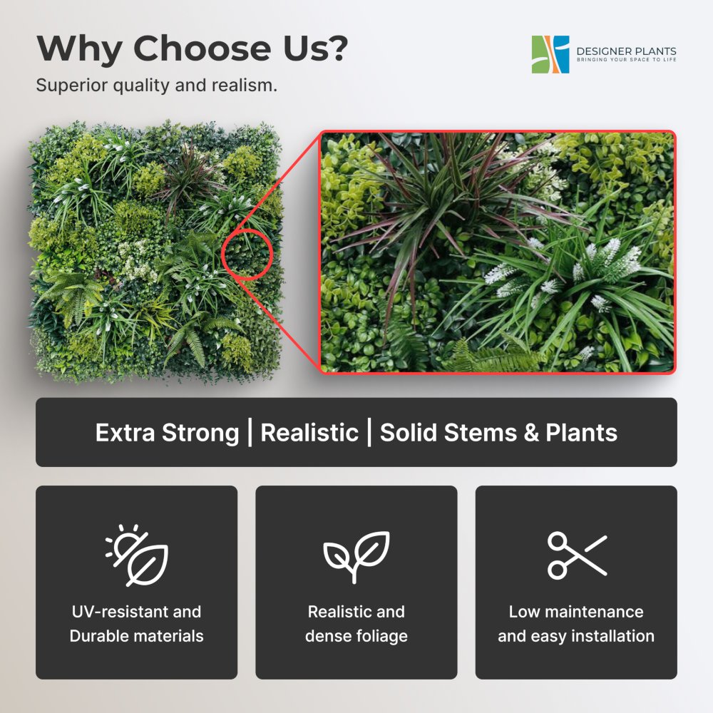 Thoughtfully crafted with our advanced UV protection technology, this artificial plant wall will outlast others - Unlike a real garden that demands daily maintenance, you'll only need to dust off your fake plants once in a while and you're good to go.
